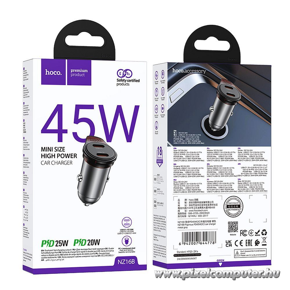 Ez az a megoldás, amely a nagy teljesítményt és a biztonságot egyesíti az autóban. A 45 W maximális teljesítmény, a két USB-C port és a modern gyorstöltési technológiák támogatása együtt biztosítják a gyors energiaellátást. A kompakt, tartós kialakítás hosszú távú használatot kínál. A Pixelcomputer kínálatában a Hoco NZ16B azoknak szól, akik útközben is stabil és hatékony töltési megoldást keresnek.
