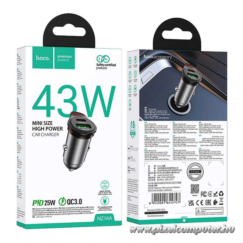 Ez az a megoldás, amely a teljesítményt és a kényelmet egyesíti az autóban. A 43 W maximális teljesítmény, a kétportos kialakítás és a PD/QC 3.0 támogatás együtt biztosítják a gyors energiaellátást. A mellékelt USB-C – Lightning kábel azonnali kompatibilitást kínál. A Pixelcomputer kínálatában a Hoco NZ16A azoknak szól, akik utazás közben is gyors és biztonságos töltést szeretnének. Csatlakoztasd eszközeidet, és indulj útnak teljes energiával.