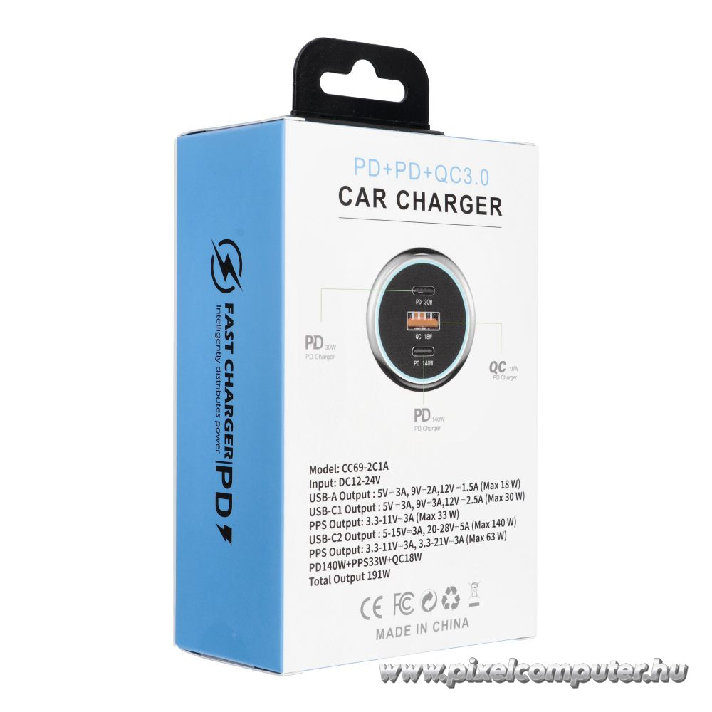Ez az a megoldás, amely egyesíti a 191W teljesítményt, a 2× USB-C PD és az USB-A QC3.0 rugalmasságát. A CC69-2C1A autós töltő stabil és gyors energiaellátást biztosít több eszköz számára egyszerre. A kompakt kialakítás praktikus és modern. A Pixelcomputer kínálatában ez a modell ideális választás, ha maximális teljesítményt szeretnél az autóban. Csatlakoztasd, töltsd, és élvezd a nagy teljesítményű mobil energiát minden utazás során.