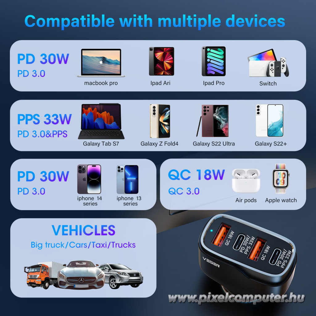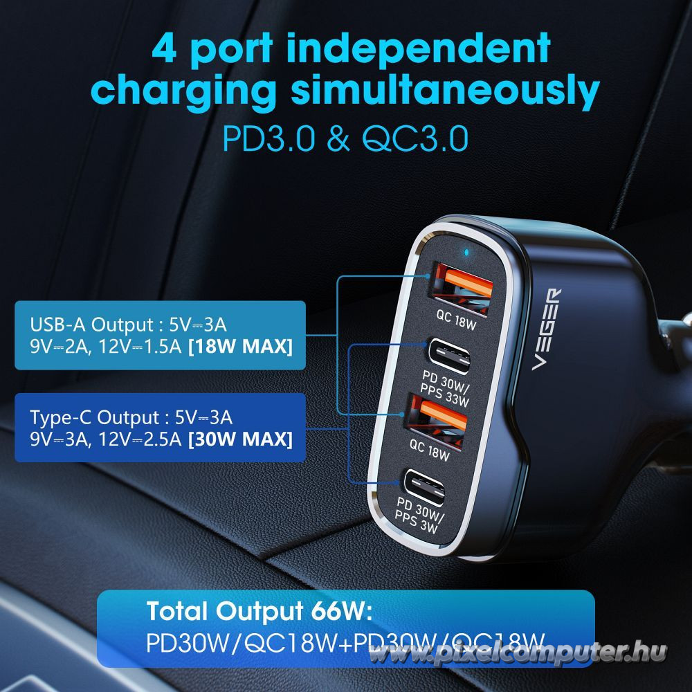 Nem véletlen, hogy a nagy teljesítményű autós töltők egyre népszerűbbek. A Pixelcomputer vásárlói is értékelik a 66W teljesítményt és a négy portos kialakítást. A PD és QC kompatibilitás gyors töltést biztosít modern eszközökhöz. A többcsatlakozós megoldás ideális hosszabb utakhoz. Az intelligens energiaelosztás növeli a biztonságot. A stabil működés menet közben is megbízható. A konstrukció ellenáll a rendszeres használatnak. A kompakt kivitel praktikus megoldás. A teljesítményelosztás kiegyensúlyozott marad. A modern technológia egyszerű használatot kínál. A pozitív tapasztalatok erősítik a választást. A VEGER 66W 2×USB-C + 2×USB-A autós töltő ideális megoldás gyors és biztonságos töltéshez útközben. Válaszd a nagy teljesítményt a Pixelcomputer kínálatában.