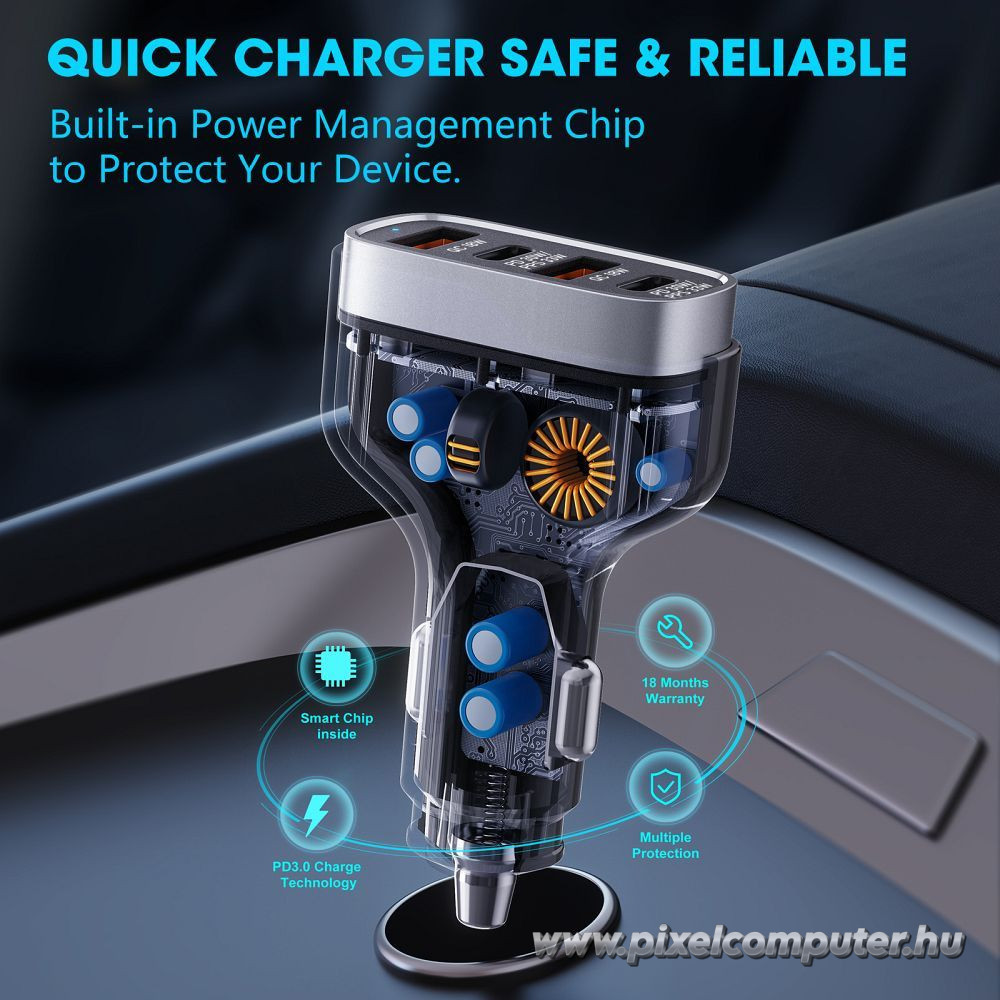 A PC anyagból készült burkolat ellenáll a hőnek és a mindennapi igénybevételnek. A kompakt kialakítás nem foglal felesleges helyet az autóban. A töltő stabilan illeszkedik a szivargyújtó aljzatba. A masszív szerkezet hosszabb távú használatra készült. A kialakítás modern és letisztult. A többportos megoldás csökkenti a szükséges adapterek számát. A négy eszköz egyidejű töltése kényelmes megoldás családi vagy üzleti utazások során. A konstrukció támogatja az intenzív napi használatot. A stabil csatlakozás csökkenti a megszakítás esélyét. A kompakt méret növeli a praktikusságot. A strapabíró PC ház tartósságot biztosít.
