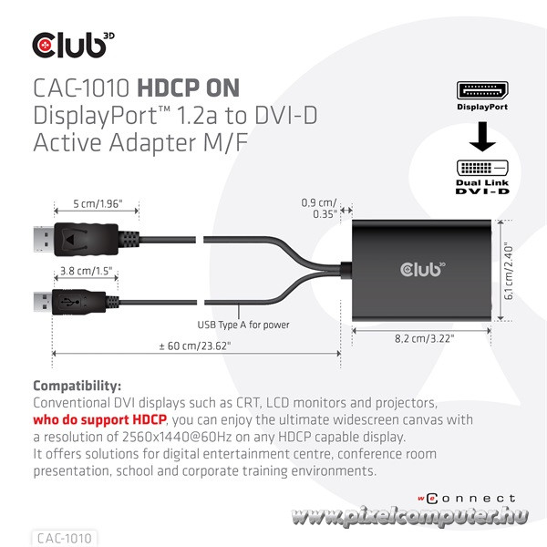 Azoknak készült ez a termék, akik nem akarnak kompromisszumot kötni a minőség és a funkcionalitás terén. Ha neked fontos, hogy egyetlen adapterrel bármilyen modern DisplayPort™ rendszeredet össze tudd kötni egy klasszikus DVI kijelzővel, akkor a Club 3D CAC-1010 pontosan neked szól.