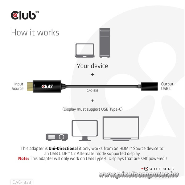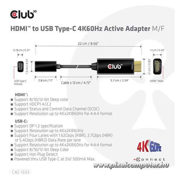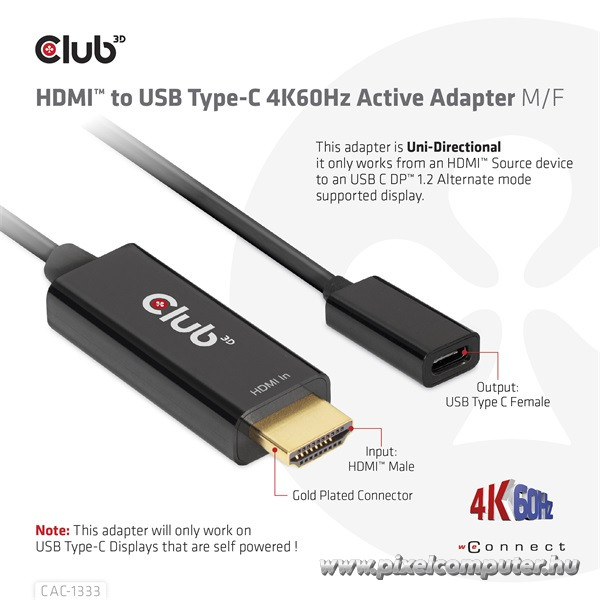 Club 3D Átalakító - CAC-1333 (HDMI to USB-C aktív, 4K60Hz, M/F)