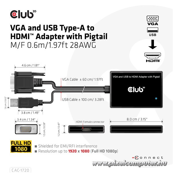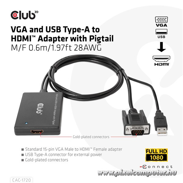 A Club 3D CAC-1720 technikai előnyei közül kiemelkedik a kiváló minőségű aranyozott csatlakozók használata, amelyek javítják a jelátvitelt és csökkentik a korrózió esélyét. A 28AWG vastagságú árnyékolt kábel nemcsak tartós, hanem hatékonyan védi a jelet a külső zavaroktól. Az EMI/RFI védelem különösen fontos, ha az adaptert olyan környezetben használja, ahol sok elektronikai eszköz működik egyidejűleg. A Full HD felbontás támogatása biztosítja, hogy prezentációi, videói és képei mindig élesek és részletgazdagok maradjanak. A beépített USB-A tápellátás stabil energiát biztosít a működéshez, ami különösen régebbi VGA eszközöknél elengedhetetlen. Az adapter plug and play módon működik, vagyis nem igényel bonyolult beállítást vagy illesztőprogram telepítést.