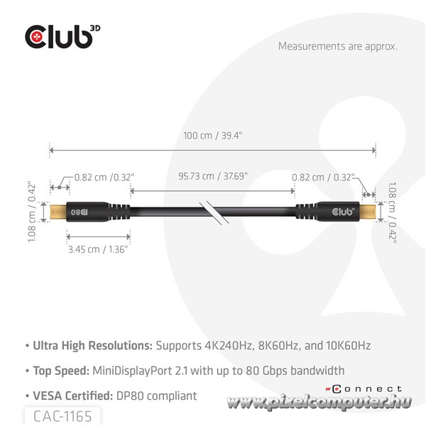 A Club 3D CAC-1165 a legújabb generációs adatátvitel és képminőség szimbóluma. A 4K240Hz, 8K60Hz és 10K60Hz támogatás garantálja, hogy a jövő kijelzőihez is készen állsz, legyen szó gamingről, professzionális munkáról vagy multimédiáról. A Pixelcomputer vásárlói szerint ez az egyik leginnovatívabb Mini DisplayPort kábel a piacon, amely évekig biztosít hibátlan teljesítményt.