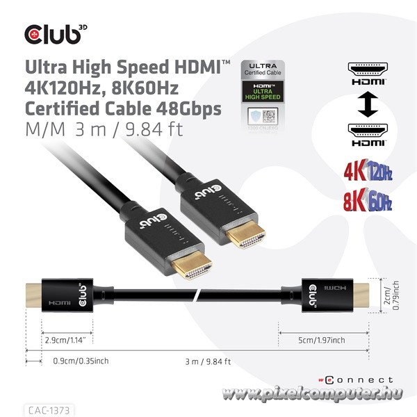 A Club 3D CAC-1373 kábel nem ismer kompromisszumot: tökéletes azok számára, akik nagy távolságon is zavartalan, prémium adatátvitelt szeretnének. Az Ultra High-Speed HDMI 2.1 tanúsítvány biztosítja, hogy minden modern funkció – VRR, QFT, QMS, HDR, eARC – tökéletesen működjön. Ez a kábel nemcsak ideális játékhoz és filmnézéshez, hanem professzionális környezetben is helytáll, ahol a stabilitás és a megbízhatóság kulcsfontosságú. A 3 méteres hosszúság mellett is garantált a veszteségmentes adatátvitel.