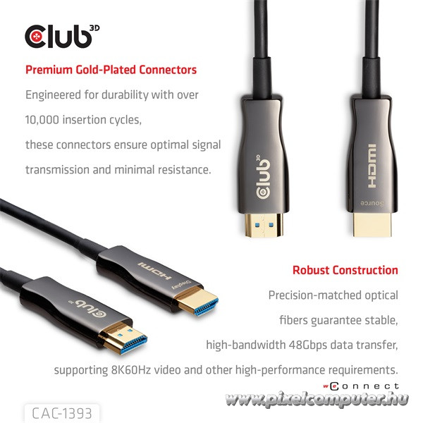 A Club 3D CAC-1393 azoknak szól, akik számára a kép- és hangminőség nem alku tárgya. Professzionális felhasználásra, nagy távolságú jelátvitelre vagy igényes otthoni megoldásokhoz készült. A hibrid optikai technológia révén akár 50 méteres távolságon is garantált a torzításmentes, stabil adatátvitel – ez az, amit a prémium kategóriás installációk megkövetelnek. A Pixelcomputer ügyfelei különösen értékelik, hogy ezzel a kábellel megszűnnek a jelvesztésből vagy interferenciából adódó problémák, és a teljes rendszer megbízhatóbban, tisztábban és gyorsabban működik.