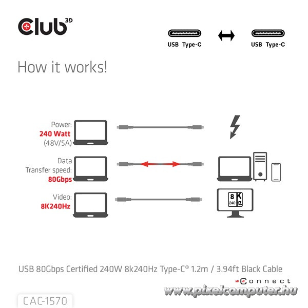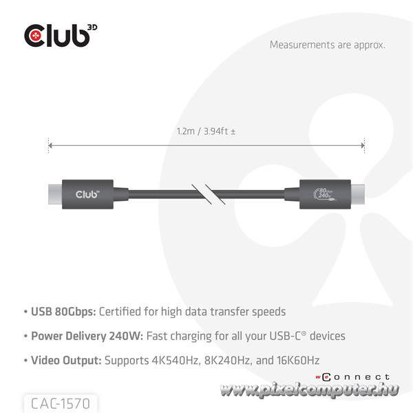 Rendeld meg most a Pixelcomputer webáruházban, és tapasztald meg a 80 Gbps sebességű, 240 W-os teljesítményű adatátvitelt – a Club 3D CAC-1570 USB4 Type-C kábellel, amely a jövő technológiáját hozza el a jelenbe!