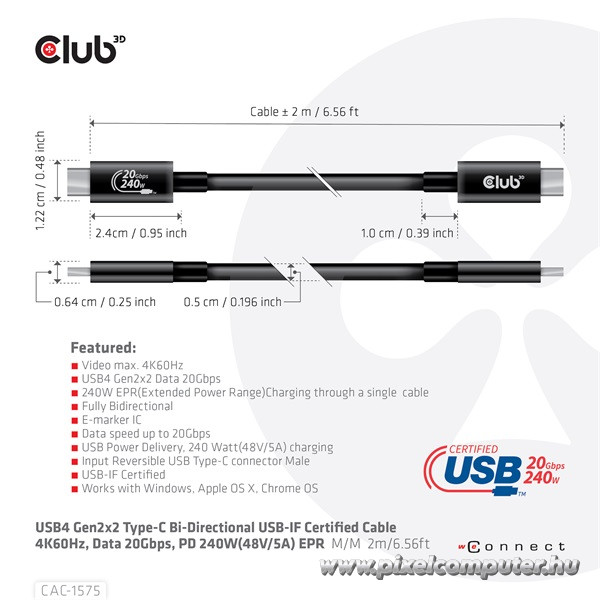 A beépített E‑Marker chip és a Re‑timer technológia biztosítja, hogy az adat- és videójel épp olyan stabil maradjon 2 méteren keresztül, mint egy rövid kábelen. Ez a technológia minimalizálja a jelromlást és biztosítja a 20 Gbps adatátvitelt DRM-védett 4K kijelzőkkel is. Ha fontos számodra, hogy akár prezentációt, akár videóvágást végezz külső kijelzőn vagy VR headseten – ez a kábel stabil és zökkenőmentes élményre képes. Az USB4 Gen 2×2 szabvány nyújtotta teljesítmény és lefelé kompatibilitás révén egy jövőálló, megbízható megoldás egyetlen eszközben.