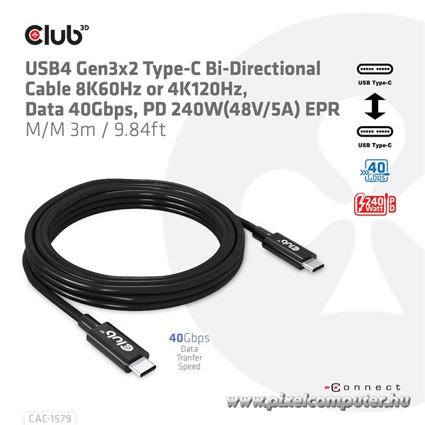 Club 3D Kábel - CAC-1579 (USB4 Type-C Gen 3x2, Bi-directional, 8K60Hz, 40Gbps, 240W PD, EPR, 3m)