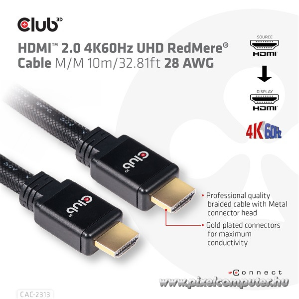 A Club 3D CAC-2313 HDMI™ 2.0 4K60Hz kábel azoknak készült, akik nem elégszenek meg átlagos minőséggel, és hosszú távú, stabil kapcsolatra vágynak a legmodernebb kép- és hangélmény mellett. A 10 méteres hosszúság ellenére ez a kábel RedMere® technológiájának köszönhetően kompromisszummentes, aktív jelfeldolgozással garantálja a tökéletes adatátvitelt még nagy távolság esetén is. Legyen szó játékhoz, házimozihoz, prezentációhoz vagy munkaállomások összekötéséhez – ez a kábel minden szempontból kiemelkedőt nyújt.