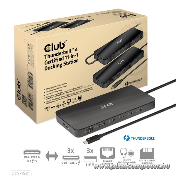 A Club 3D CSV-1581 Thunderbolt™ 4 dokkoló a profik választása, akik nem elégednek meg kevesebbel, mint a tökéletes csatlakoztathatósággal. Ez a dokkoló egyesíti a csúcsteljesítményt és a kompakt méretet, lehetővé téve, hogy akár három Thunderbolt eszközt kaszkádszerűen is összekapcsolj, miközben a maximális adatátviteli sebesség eléri a 40 Gbps-t. A lehetőségek szinte végtelenek: külső kijelzők, merevlemezek, hálózatok, kártyaolvasók és hang – mind egyetlen, gyors csatlakozón keresztül.