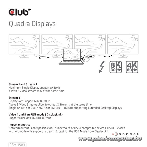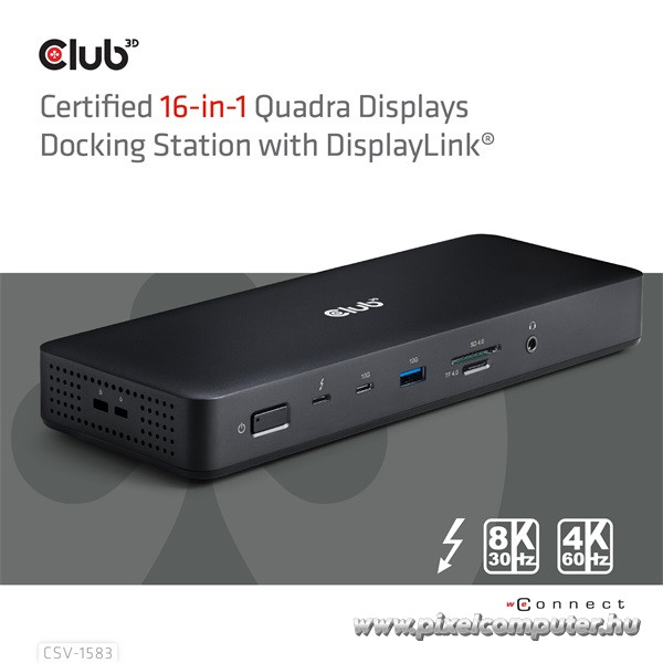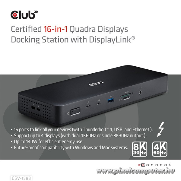 A Club 3D CSV‑1583 nem csupán egy dokkoló, hanem egy valódi munka- és élményközpont. A Thunderbolt 4 és USB4 kompatibilitás lehetővé teszi akár négykijelzős setup használatát (Mac‑eknél akár 8K30Hz vagy dupla 4K60Hz), míg Windows alatt maximalizálhatod a Windows GPU használatot. A beépített Gigabit Ethernet, SD/TF olvasó és audio port megszünteti a további periféria szükségességét. A 140 W-os intelligens töltés pedig gond nélkül kiszolgál modern erős laptopokat, miközben a dokkoló eszközöket is táplálja. Minimális helyigénnyel nyújt maximális funkcionalitást.