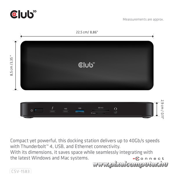 A prémium anyaghasználat (alumínium borítás, stabil kialakítás) és a kis méret (kb. 22,5 × 8,5 cm) révén a dokkoló irodai vagy otthoni környezetben is esztétikus és praktikusan elhelyezhető. A plug-and-play működés minden operációs rendszerrel kompatibilis, nincs szükség extra driverre. A Thunderbolt 4 retina videó továbbítás és USB adatátvitel prioritása garantálja, hogy egyszerre több munkafolyamatot is zökkenőmentesen futtathatsz. Ha nagy teljesítményt szeretnél biztonságosan, stabilan csatlakoztatott eszközökkel egy kompakt kütyüben: a CSV‑1583 a megoldás.