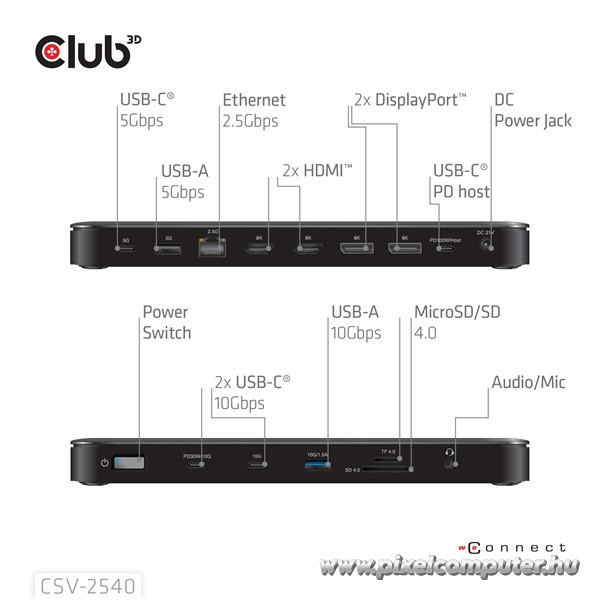 A dokkoló műszaki alapja a DisplayPort 2.1 Alt Mode, amely támogatja az RBR, HBR, HBR2, HBR3, valamint az UHBR10, UHBR13.5 és UHBR20 adatátviteli sebességeket. Ez teszi lehetővé a nagy sávszélességű videójelek stabil továbbítását akár 8K30Hz vagy 4× 4K60Hz konfigurációban. A pixel formátumok támogatása RGB és YCbCr 4:4:4 / 4:2:2 / 4:2:0 módokkal széles kompatibilitást biztosít. A HDR10+ és HDCP 1.4/2.3 támogatás prémium tartalomkezelést eredményez. A 2.5G Ethernet hálózati vezérlő gyors adatforgalmat biztosít. Az USB portok 5Gbps adatátviteli sebességet kínálnak. A dedikált USB-C port akár 30W töltést biztosít mobil eszközök számára. A 100W PD biztosítja a laptop energiaellátását. A bekapcsológomb és a LED jelző egyszerű vezérlést tesz lehetővé. A külső 150W-os tápegység teljes stabilitást ad nagy terhelés mellett is. A konstrukció Thunderbolt és teljes funkcionalitású USB-C laptopokkal kompatibilis. A rendszer egyetlen USB-C kapcsolaton keresztül működik. A stabilitás a teljes működés során elsődleges.