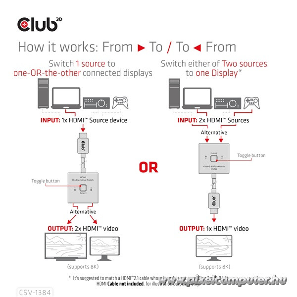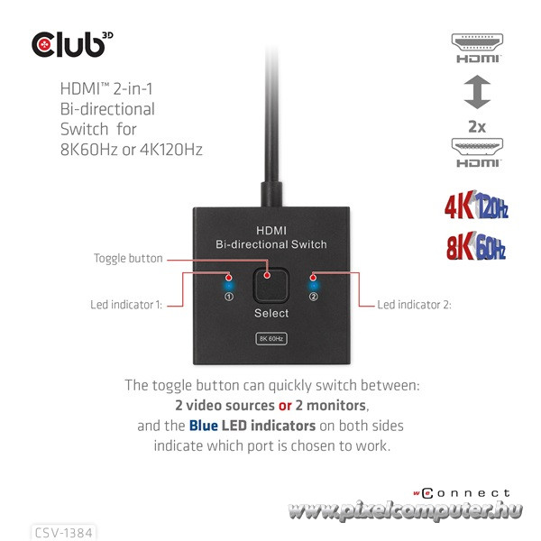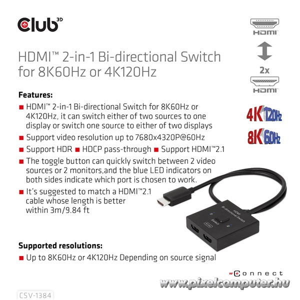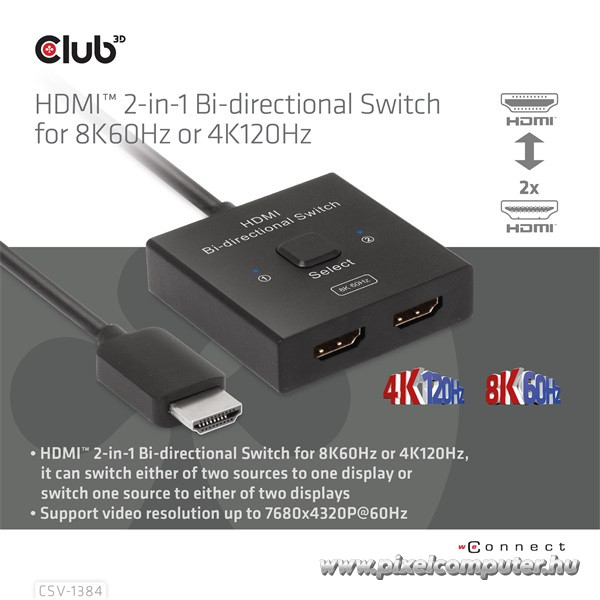 Válts kényelmesen, élvezd a 8K és 4K tartalmakat kompromisszumok nélkül, és szerezd be most a Pixelcomputer webáruházából a Club 3D CSV-1384 HDMI kapcsolót, ami egyedülálló módon ötvözi a funkcionalitást és a prémium képminőséget!