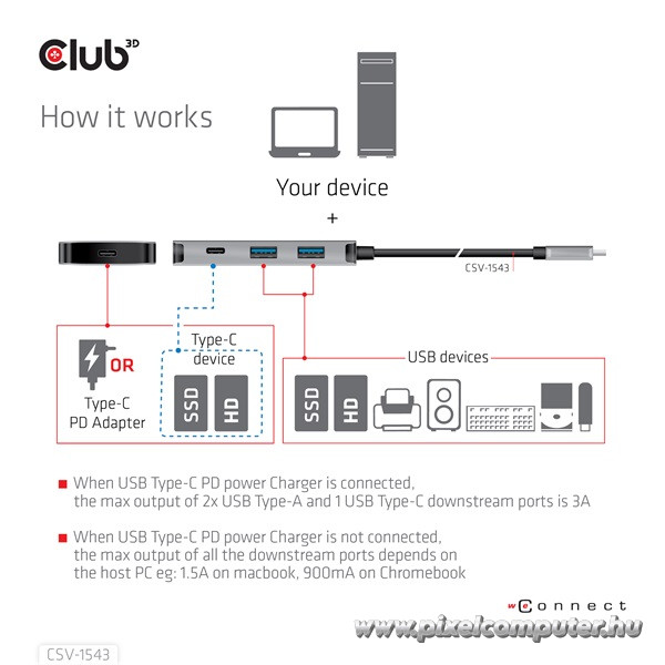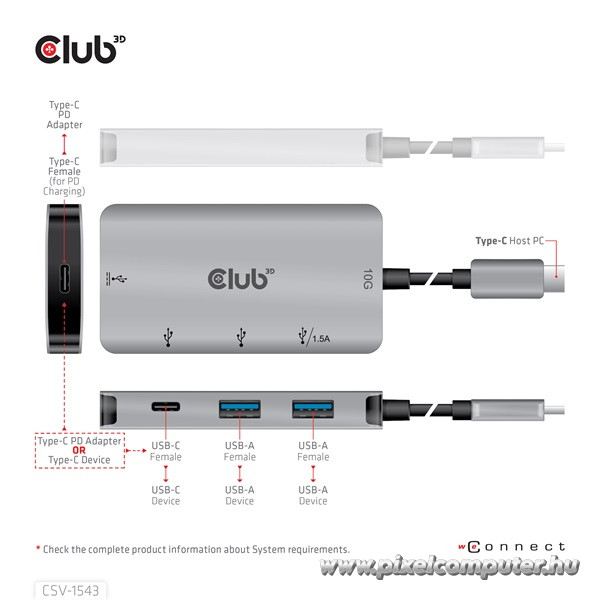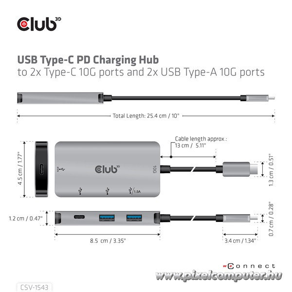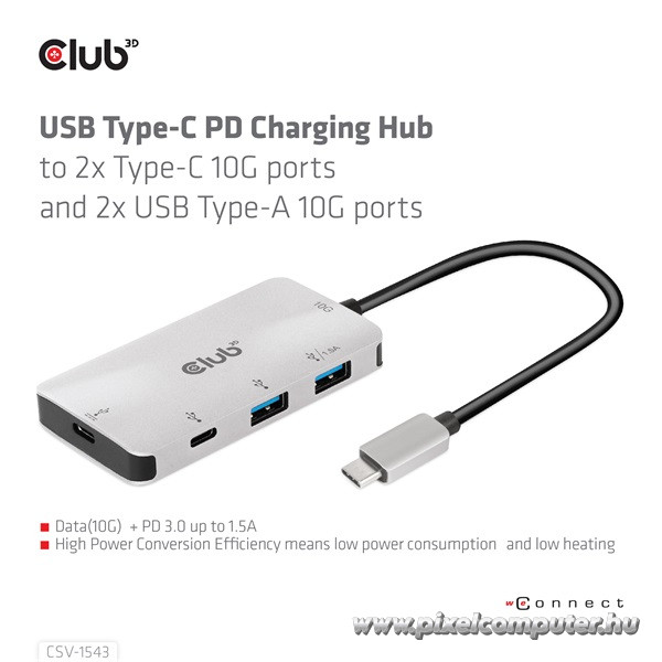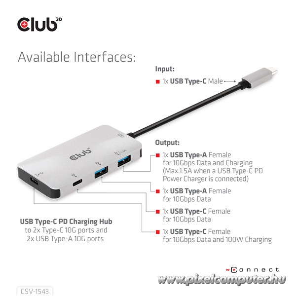 Club 3D USB Hub - CSV-1543 (USB-C Gen 2 to USB-C (data), USB-C (data+charge), USB-A (data), USB-A (data+charge)