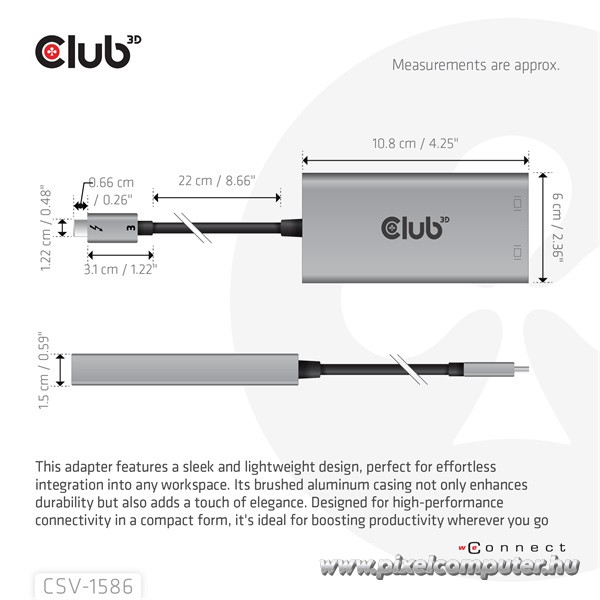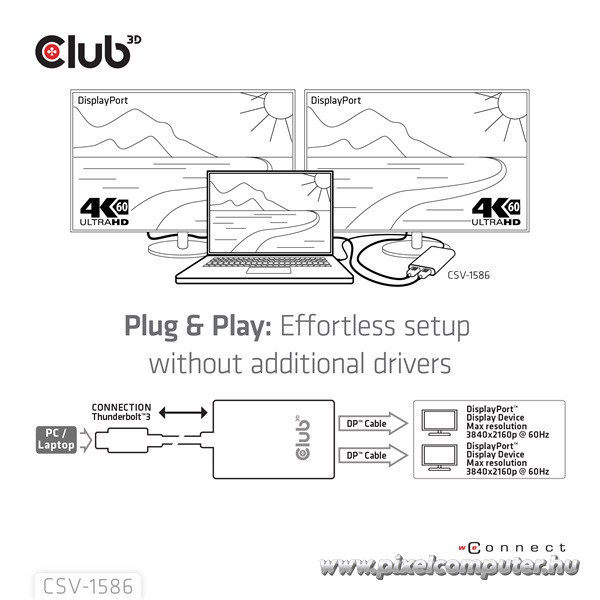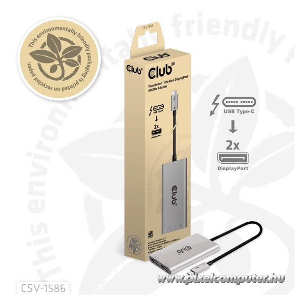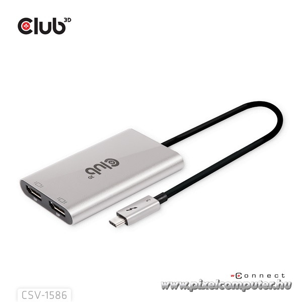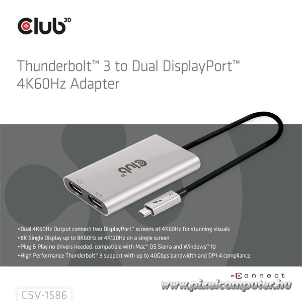 A Club 3D CSV‑1586 Thunderbolt 3 – Dual DisplayPort adapter ideális eszköz, ha üllesztés nélkül szeretnél két DisplayPort monitort kezelni, vagy ha a legmagasabb felbontást szeretnéd kiaknázni egyetlen Thunderbolt porton keresztül. Legyen szó irodai használatról, kreatív munkáról vagy produktív multitaskingról – ezzel az adapterrel képernyőd hatékonysága négyzetesen nő meg. Válaszd a CSV‑1586-ot a Pixelcomputernél, és használd ki a többmonitoros munkavégzés, magával ragadó képminőség és stílusos kivitel előnyeit kompromisszumok nélkül!