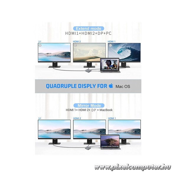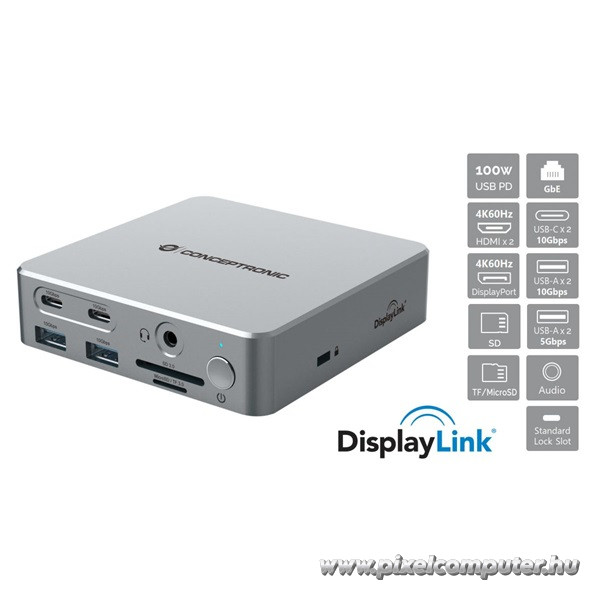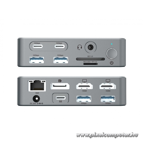 A Pixelcomputernél elérhető dokkoló egy kompakt méretű erőmű, ami minden funkciót egy elegáns, fémházba sűrít. A Gigabit Ethernet kapcsolat megszünteti a lassú, instabil vezeték nélküli hálózatok okozta frusztrációt, míg a USB 3.2 Gen 2 csatlakozók garantálják a gyors fájlműveleteket. A kettős SD/microSD kártyaolvasó különösen hasznos lehet fotósoknak, videósoknak vagy IT-adminisztrátoroknak, akik egyszerre több adattárolóról szeretnének dolgozni. A 120W teljesítményű tápegység lehetővé teszi, hogy a notebook mellett egyéb eszközöket is hatékonyan láss el árammal. A beépített Power On/Off kapcsoló további kontrollt ad a használat során.