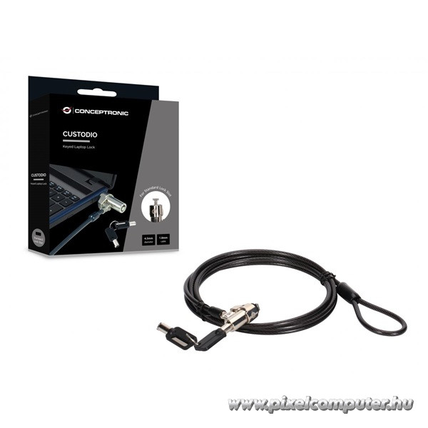 Rendeld meg a Conceptronic CUSTODIO02BS notebook kábelzárat a Pixelcomputer webáruházból, és biztosítsd laptopod, monitorod vagy más értékes eszközöd védelmét gyorsan, hatékonyan és stílusosan!