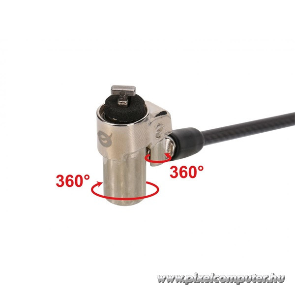A kábelzár egyszerűen használható: a Standard Security Slot (3x7 mm) rögzítőpontba illeszthető, majd a kábel másik végét egy fix ponthoz – például asztalhoz vagy polchoz – kell erősíteni. A 360°-ban forgatható zárrész megakadályozza a kábel csavarodását, így a zár minden helyzetben stabil marad. A mellékelt két kulcs kényelmes megoldást kínál arra az esetre is, ha egyet elveszítenél.