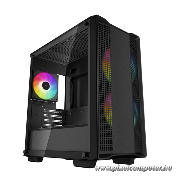 A DeepCool CC360 ARGB ház egyértelműen a stílus és funkcionalitás találkozása. A három előre beszerelt 120 mm-es ARGB ventilátor nemcsak kiváló hűtést biztosít, hanem látványos, testreszabható világítást is ad a rendszerednek. Az edzett üveg oldallap révén a konfigurációd minden részlete megmutatható, legyen szó prémium hűtésről vagy látványos alkatrészekről.