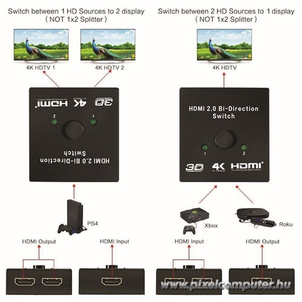 A sokoldalúság valódi előnye a kétirányú működésben rejlik, amely rugalmas felhasználást tesz lehetővé. Az első üzemmódban két HDMI forrás csatlakoztatható egyetlen kijelzőhöz. A második opcióban egy HDMI forrás jele váltható két különböző kijelző között. A váltás egyszerűen a beépített választógombbal történik. Egyszerre mindig csak egy kijelző aktív, ami stabil jelkezelést biztosít. A rendszer ideális Blu-ray lejátszó, játékkonzol vagy médialejátszó használatához. A 4K/60Hz támogatás nagy felbontású megjelenítést biztosít. A HDR kompatibilitás élénkebb és kontrasztosabb képet eredményez. A HDCP 2.2 támogatás modern streaming eszközökkel is kompatibilis. A sávszélesség elegendő a folyamatos lejátszáshoz. A hang- és képadat egyaránt stabil marad. A rendszer támogatja a nagy felbontású hangformátumokat. A 3D támogatás további kompatibilitást kínál. A váltás során a jelminőség nem romlik. A működés gyors és megbízható. A készülék kis helyigényű. A kompakt kialakítás egyszerű telepítést tesz lehetővé. A rendszer rugalmas megoldást kínál különböző környezetekben. A csatlakoztatás átlátható. A használat kényelmes. Ez az a funkcionalitás, amely valódi szabadságot ad a HDMI eszközök kezelésében.