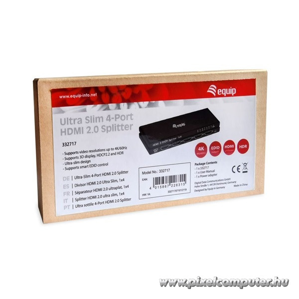 Ha több kijelzőn szeretnél egyszerre, szinkronban megjeleníteni 4K tartalmat, a 4K/60Hz és 4 portos HDMI 2.0 támogatás stabil alapot ad. Ez az, ami miatt ez a választás valóban okos döntés. A HDR és HDCP 2.2 kompatibilitás modern tartalmakhoz is ideális. Az automatikus EDID kezelés leegyszerűsíti a használatot. Az alumínium ház tartós konstrukciót biztosít. Az ultra slim kialakítás helytakarékos megoldás. A rendszer megbízhatóan osztja szét a jelet négy kijelzőre. A telepítés gyors és átlátható. A működés stabil marad hosszú távon is. A kompatibilitás széles körű. A jelminőség egységes minden kimeneten. A készülék támogatja a 3D formátumot is. A sávszélesség elegendő a folyamatos lejátszáshoz. A rendszer modern audiovizuális környezetbe illeszkedik. A működés kiszámítható. A teljesítmény kiegyensúlyozott. A vizuális élmény magas szintű. A döntés tudatos választás. A megbízható működés minden helyzetben előnyt jelent. Válaszd most az Equip 332717 HDMI Splittert, és építs stabil, többkijelzős rendszert kompromisszumok nélkül.