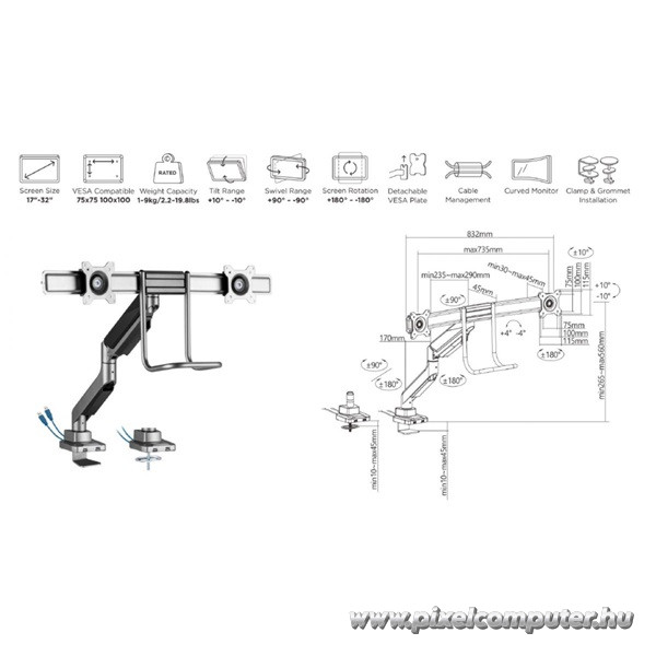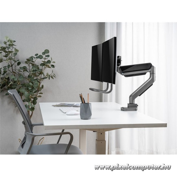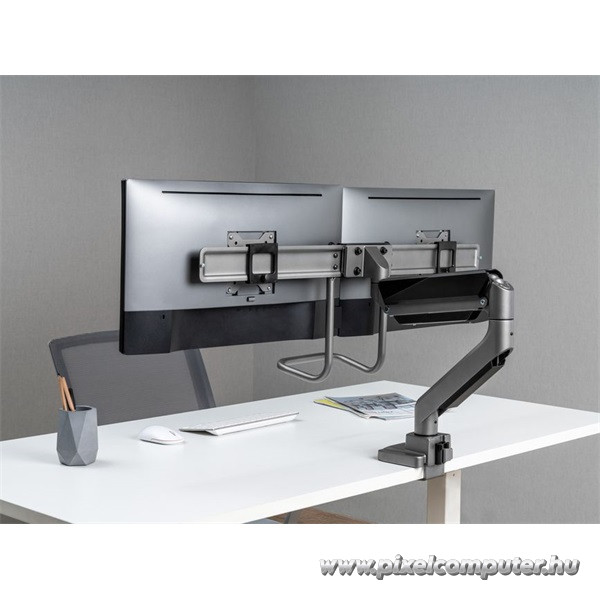 A kábelrendező rendszer nemcsak esztétikus, hanem praktikus megoldás is: a monitorhoz vezető kábelek diszkréten elrejthetők, így az asztal rendezett és profi benyomást kelt. A 9 kg-os teherbírás biztosítja, hogy akár nagyobb, 32 hüvelykes kijelzők is biztonságosan rögzíthetők. A VESA-kompatibilis rögzítési pontok (75×75, 100×100) univerzálisan illeszkednek a legtöbb modern monitorhoz, így nincs szükség további adapterre. A Pixelcomputer kínálatában ez a modell a funkcionalitás és a dizájn tökéletes kombinációját nyújtja.