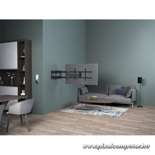 A széles mozgástartomány és az akár 1015 mm-es kinyúlás révén a konzol bármilyen helyiséghez alkalmazkodik. A VESA-kompatibilis kialakítás (200×200 – 800×400) szinte minden nagyobb márkával kompatibilis, így a telepítés gyors és egyszerű. A kábelrendező rendszer diszkréten elrejti a vezetékeket, így a teljes megjelenés letisztult és esztétikus marad. A Pixelcomputer vásárlói különösen értékelik, hogy a tartó még teljes kinyúlás mellett is stabilan és rezgésmentesen tartja a televíziót.