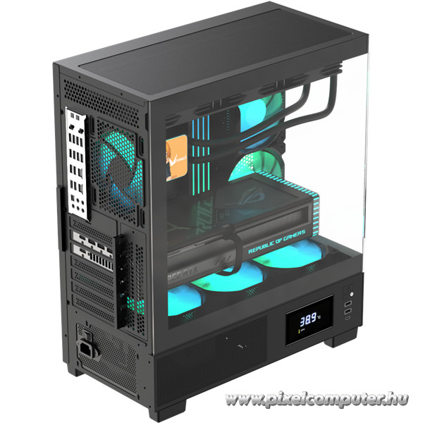 A hűtési megoldások terén a Crystal E1 FLOE kiemelkedő. A ház támogatja a 360 mm-es vízhűtő radiátorokat, valamint akár több ventilátoros konfigurációkat is, így a rendszer mindig optimális hőmérsékleten tartható. A beépített három ventilátor csendesen, mégis hatékonyan gondoskodik a levegőáramlásról, így a ház ideális alap egy hűvös és halk gamer PC-hez. A Pixelcomputer ügyfelei dicsérik a hatékony légáramlási elrendezést és a hűtési lehetőségek rugalmasságát, amely még nagy teljesítményű komponensek esetén is megőrzi a rendszer stabilitását.