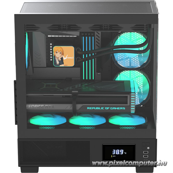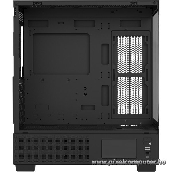 A Type-C és kettős USB 3.0 portokkal ellátott előlapi panel biztosítja a gyors adatátvitelt és a modern perifériák csatlakoztatását. Emellett a beépített kijelzőkapcsoló-panel modern, felhasználóbarát vezérlést kínál, ami még kényelmesebbé teszi a rendszer használatát. A Pixelcomputer vásárlói kiemelik, hogy a ház előlapi csatlakozói és a precízen elhelyezett szellőzőrendszer igazi prémium érzetet adnak a mindennapi használat során.