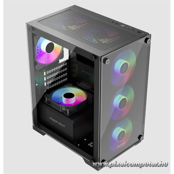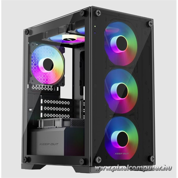 A KEEP OUT XC-201 GLASS kompakt mérete ellenére lenyűgöző teljesítményt és megjelenést nyújt. A négy előre szerelt 120 mm-es ARGB ventilátor kiváló hűtést biztosít, miközben látványos fényhatásokkal varázsolja el a környezetet. Az edzett üveg oldallap lehetővé teszi, hogy a géped belsejét stílusosan bemutasd, így minden konfiguráció vizuálisan is kiemelkedik. A Pixelcomputer kínálatában ez a ház az egyik legjobb választás kis méretű, mégis nagy teljesítményű gaming setupokhoz.