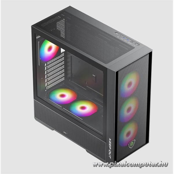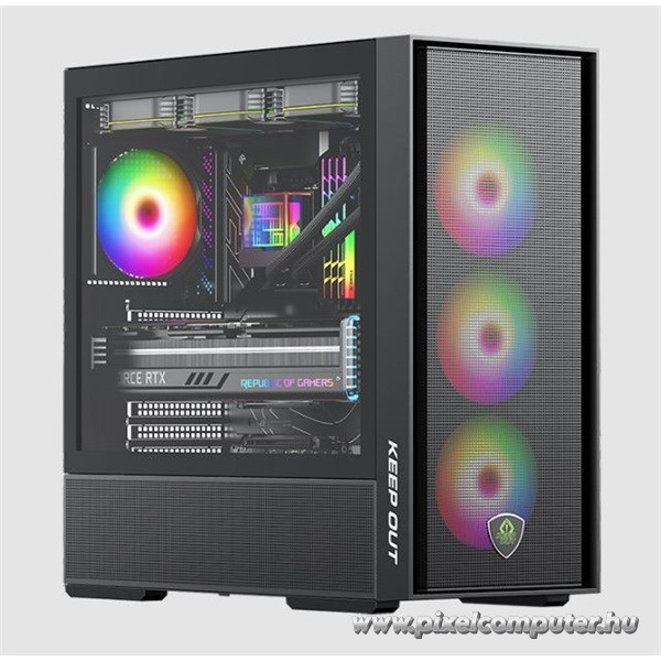 A KEEP OUT XC-805 MESH a teljesítményorientált felhasználók számára készült. A szellőző mesh előlap és a hat darab ARGB ventilátor biztosítják a kivételes hűtést, így a rendszered még nagy terhelés mellett is hűvös és stabil marad. Az edzett üveg oldallap prémium megjelenést nyújt, miközben lehetőséget ad arra, hogy megmutasd a géped belsejét. A Pixelcomputer kínálatában ez a modell a gamer házak új generációját képviseli, ahol a design, funkcionalitás és hatékonyság tökéletesen találkozik.
