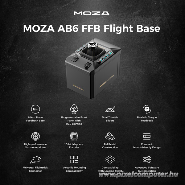 Rendeld elő a MOZA AB6 Flight Simulator joystick alapot, és tapasztald meg a valósághű repülési szimuláció új szintjét a Pixelcomputer kínálatában.