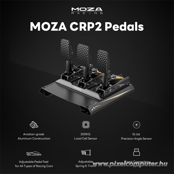 A Moza CRP2 pedál szett azoknak készült, akik nem csupán játszanak, hanem versenyeznek. Azoknak, akik érzik, hogy a szimulátorban töltött idő több, mint szórakozás – ez szenvedély, precizitás és teljesítmény. Ideális választás e-sport versenyzőknek, profi szimulátoros pilótáknak, vagy mindazoknak, akik szeretnék otthonukban megtapasztalni a versenypályák adrenalinnal teli világát. A Pixelcomputer kínálatában elérhető CRP2 pedálok garantálják, hogy a legapróbb mozdulat is érezhető legyen, és minden tizedmásodperc számítson. A konstrukció nemcsak tartós, hanem inspiráló: a repülőgépipari alumínium és a szénszálas elemek kombinációja az erő, a precizitás és az elegancia tökéletes harmóniáját nyújtja.