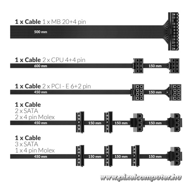 A 120 mm-es ventilátor halk, mégis hatékony légáramlást biztosít, így a tápegység mindig ideális hőmérsékleten működik. Az aktív PFC technológia stabilizálja az áramellátást, csökkenti az elektromos zajt és javítja a teljes rendszer hatékonyságát. Az 5 SATA és 2 PCIe csatlakozó lehetővé teszi, hogy több meghajtót és akár nagyobb teljesítményű videokártyát is könnyedén csatlakoztass, így a tápegység teljes mértékben készen áll a bővíthető konfigurációk kiszolgálására.