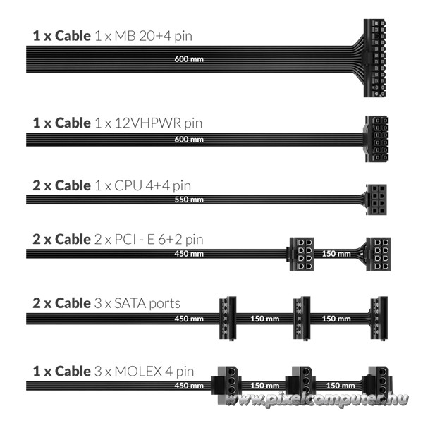 A 12VHPWR csatlakozó a legújabb generációs, nagy teljesítményű grafikus kártyák (például az NVIDIA RTX 4000-es széria) számára készült. Ennek köszönhetően a tápegység teljes mértékben jövőbiztos, és készen áll a legmodernebb hardverek kiszolgálására is.