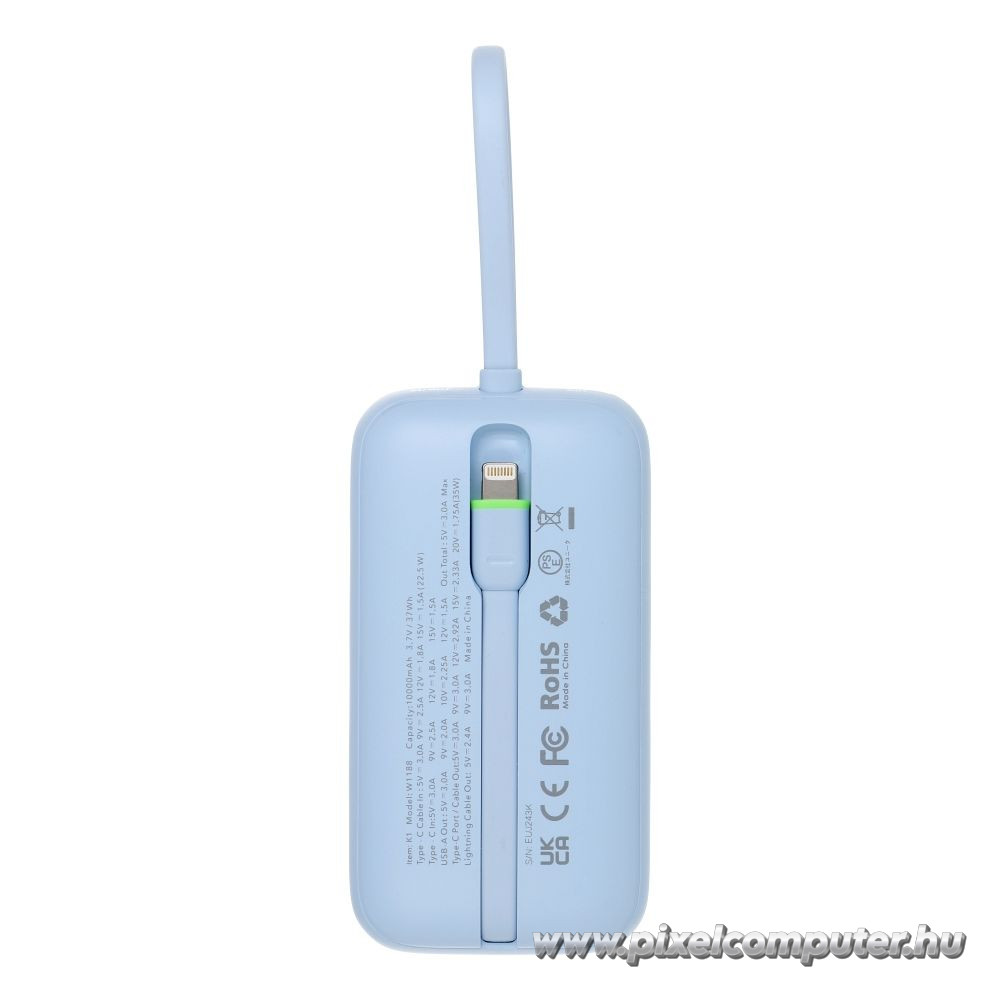 A 10000 mAh kapacitás megbízható tartalék energiát biztosít okostelefonok, fülhallgatók és egyéb mobil eszközök számára. A nagy teljesítményű 35W USB-C kimenet lehetővé teszi gyors töltést kompatibilis készülékek esetén. A 22.5W-os USB-A port és a 27W-os Lightning kábel további rugalmasságot kínál. A több kimenet lehetővé teszi több eszköz töltését. A rendszer optimalizálja az energiaelosztást. A stabil teljesítmény csökkenti a töltési időt. A nagy teljesítményű kimenetek hatékony energiaátvitelt biztosítanak.