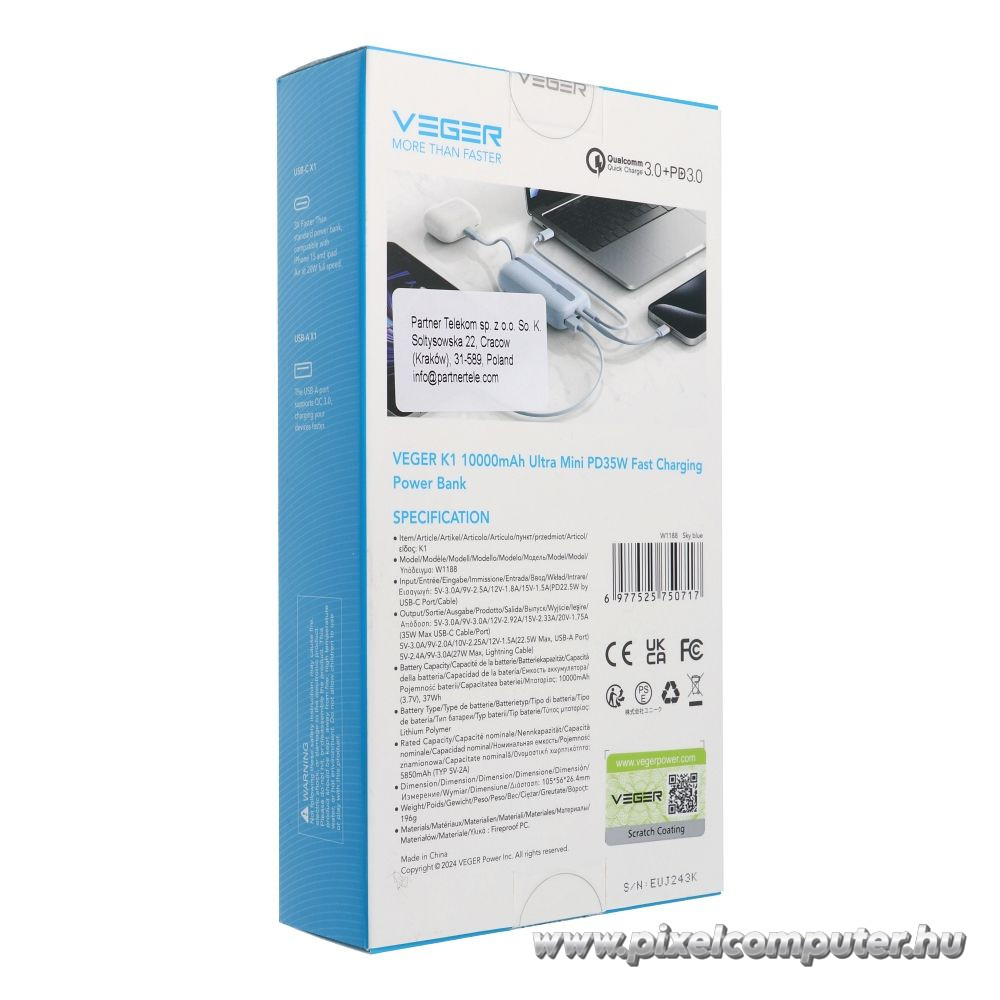 VEGER 10000 mAh Mini Power Bank – 35W, beépített kábelek, kompakt kivitel