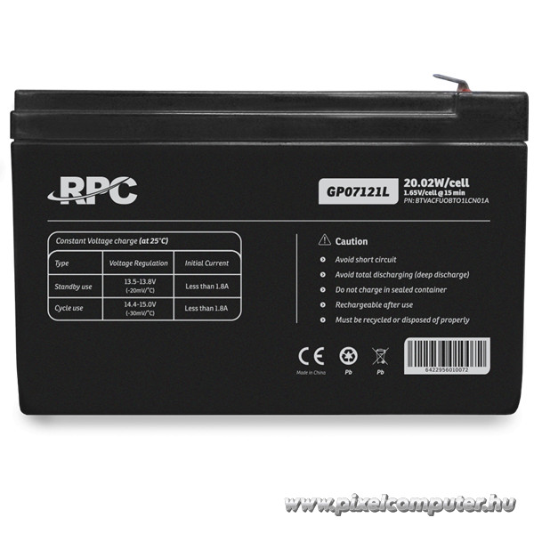A RPC GP07121L (12V/7Ah) akkumulátor minden részletében a megbízható, hosszú távú energiaellátásra lett tervezve. Teljesítménye, biztonsága és minősége révén ideális választás mind otthoni, mind professzionális környezetbe.