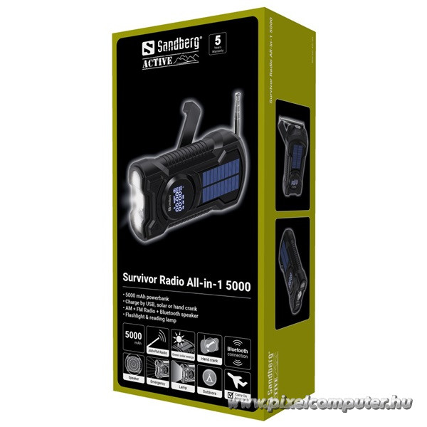 A Sandberg Survivor Radio All-in-1 5000 tökéletes választás mindazok számára, akik szeretnének felkészülten indulni bármilyen kalandra, kirándulásra vagy váratlan helyzetre. Ez a masszív és sokoldalú eszköz egyesíti a 5000 mAh kapacitású powerbankot, az AM/FM rádiót, a Bluetooth hangszórót és a zseblámpa/olvasólámpa funkciókat. Energiaellátásban sem hagy cserben: használhatod USB-n, napelemmel vagy kézi hajtókarral, így mindig számíthatsz rá, még akkor is, ha messze jársz a civilizációtól. Ha a Pixelcomputertől rendeled, biztos lehetsz abban, hogy egy prémium minőségű, hosszú élettartamú és megbízható készüléket kapsz.