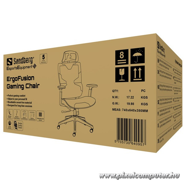 A Sandberg ErgoFusion Gaming Chair egy hosszú távú befektetés az egészségedbe és a produktivitásodba. Miközben más székek csak rövid távon kényelmesek, ez a modell éveken át megtartja formáját és alátámasztását. A fémváz, a hálóbetét és a memóriahab kombinációja a prémium szintű ergonómiát testesíti meg. A Pixelcomputer szakértői ajánlják minden tudatos játékosnak és irodai felhasználónak, aki nem hajlandó kompromisszumot kötni a kényelemben.