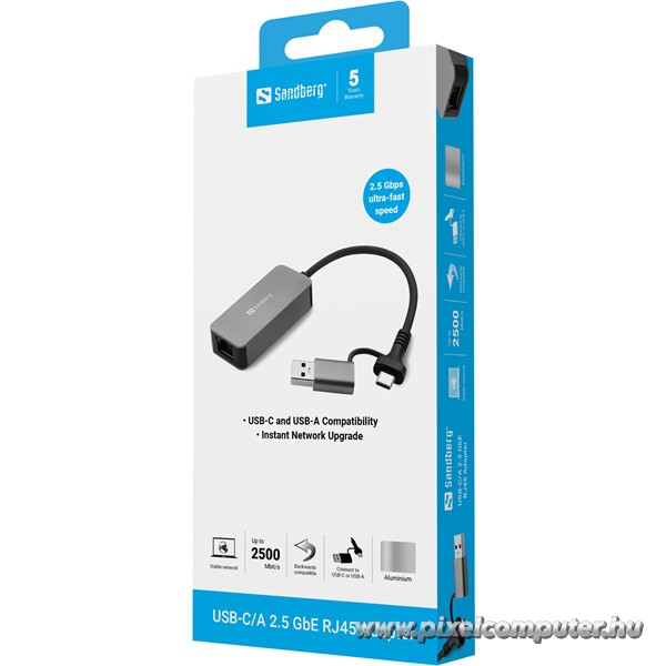 A Sandberg USB-C/A 2.5 GbE RJ45 Adapter azoknak készült, akik nem akarnak kompromisszumot kötni a sebesség vagy a stabilitás terén. Legyen szó professzionális munkáról, otthoni irodáról, online tanulásról vagy versenyszintű játékról, ez az adapter minden környezetben helytáll. A Pixelcomputer vásárlói gyakran választják, ha egy modern laptopot, PC-t vagy tabletet szeretnének vezetékes hálózattal összekapcsolni – gyorsan, egyszerűen, megbízhatóan. Az USB-C és USB-A csatlakozási lehetőség univerzálissá teszi, így régi és új eszközök között is tökéletes hidat képez.