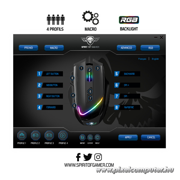 A PRO-M3 RGB egyaránt alkalmas játékra és multimédiás használatra, így tökéletes választás, ha olyan egeret keresel, ami nemcsak a játékban, hanem a mindennapi munkában is helytáll. A Pixelcomputer ajánlásával ez az egér a tökéletes társ minden gamer asztalon – stílusos, kényelmes és kompromisszummentesen pontos.