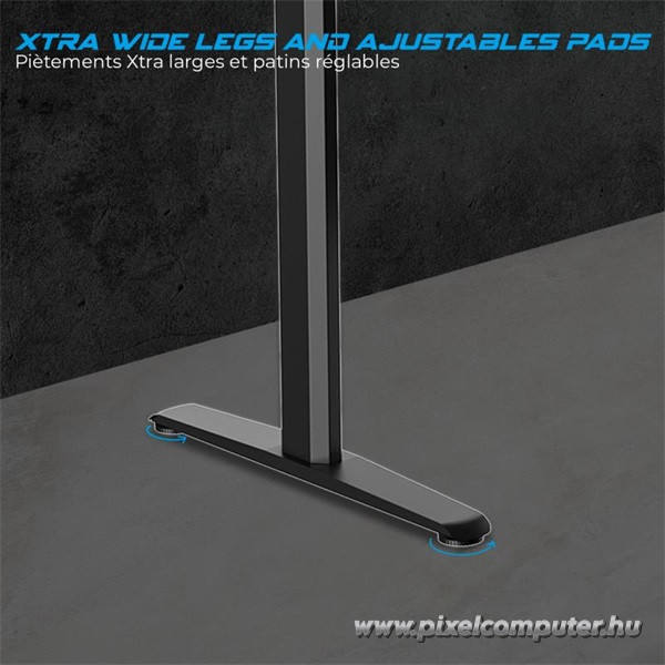 A masszív fém lábak még a legintenzívebb mozdulatoknak is ellenállnak – legyen szó gyors mozdulatokról egy FPS meccs során vagy intenzív gépelésről munkaközben. Az egyszerű gombvezérlés gyors és csendes magasságállítást tesz lehetővé, így bármikor átválthatsz álló munkavégzésre – ez fizikailag és mentálisan is frissítő hatású.