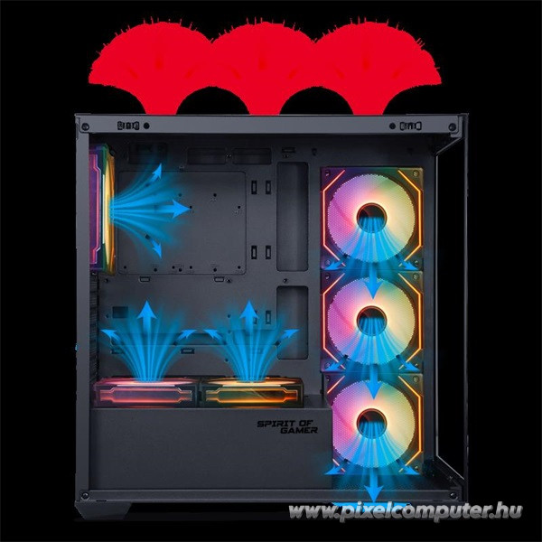 A Spirit of Gamer SPARK Black nem csak egy újabb számítógépház – ez a hőmérséklet-szabályozás, a prémium anyaghasználat és az esztétikus kivitelezés szimbóluma. Ahogy rápillantasz a fekete acélból készült házra, azonnal érezni fogod, hogy ez több mint egyszerű burkolat – ez a technológiai kifinomultság egyik leglátványosabb képviselője. A kilenc ventilátorhely és a gyárilag beépített hat ventilátor az optimális légáramlásról gondoskodik – függetlenül attól, hogy játék közben vagy grafikai szoftverek futtatása során melegszik a géped.