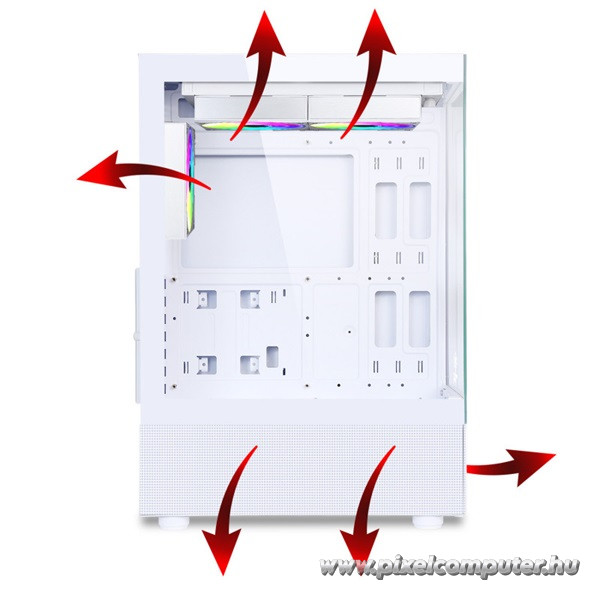 A ház hűtési rendszere kimagasló. A 3 db előtelepített 12 cm-es ventilátor gondoskodik az optimális légáramlásról, és további 2 ventilátorhely áll rendelkezésre a még extrémebb hűtési igényekhez. A fehér szín fokozza a belső RGB világítás hatását, így egy jól összeválogatott alkatrészkészlettel igazi látványgépet építhetsz. Az acélból készült váz megbízható stabilitást nyújt, míg az alsó tápos kialakítás segít a komponensek hőszabályozásában.