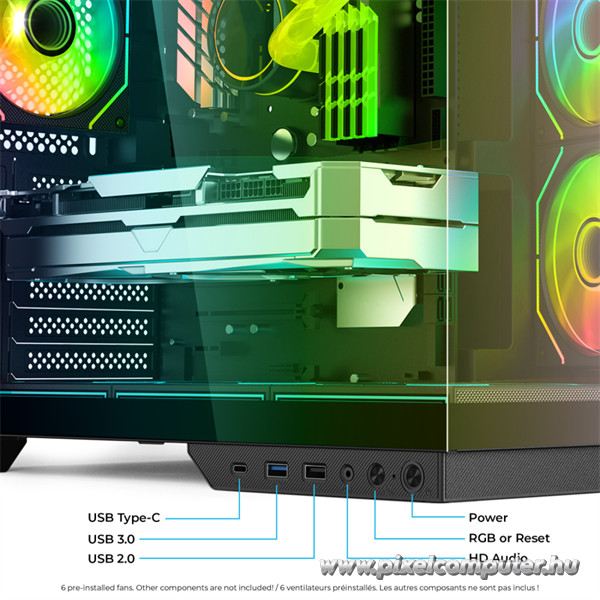A Spirit of Gamer VIPER CRX technikai megoldásai a modern számítógépház-tervezés legjobb példái. A 9 ventilátorhely, valamint a 6 gyárilag beépített ventilátor biztosítja az optimális légáramlást, így a rendszered mindig hűvös marad, még a legintenzívebb játék vagy munka közben is. A USB-C és USB-A csatlakozók gyors adatátvitelt tesznek lehetővé, a HD Audio csatlakozás pedig gondoskodik a tiszta, torzításmentes hangról. Az acél konstrukció stabil, masszív és hosszú élettartamra tervezett. Ez nem csupán egy ház – ez a teljesítmény otthona.