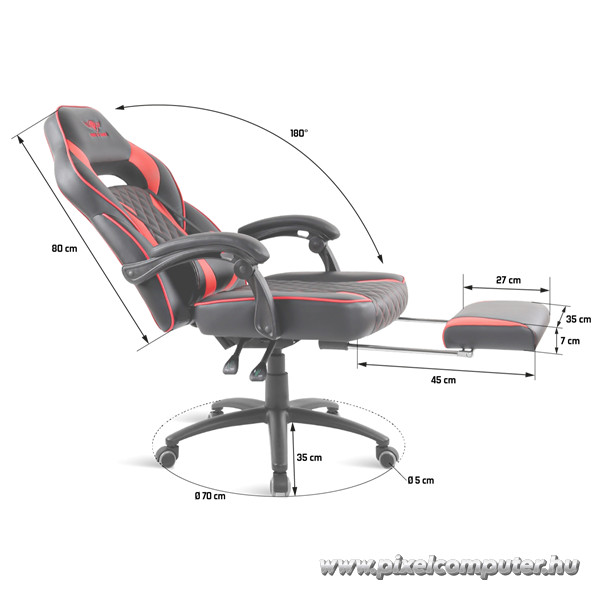 A 135 fokig dönthető háttámla, az állítható magasságú karfák és a kihajtható lábtartó lehetővé teszik, hogy minden helyzetben megtaláld a tökéletes üléspozíciót. A játék közbeni feszültséget követően egyszerűen hátradőlhetsz, kinyújthatod a lábad, és pihenhetsz anélkül, hogy elhagynád a széket. A fejpárna és deréktámasz támogatja a gerincet, miközben a puha párnázás kényelmes tartást nyújt akár egész napos használat során. A Pixelcomputer kínálatában ez a szék a prémium kényelem és a professzionális ergonómia megtestesítője.